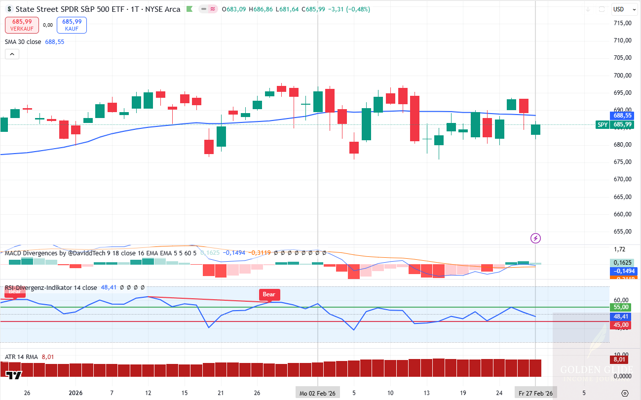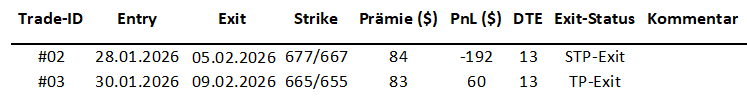 Im Folgenden wird die Anwendung der SPY 11DTE Bull Put Credit Spread Strategie im Februar 2026 unter den Bedingungen des aktuellen Marktregimes dokumentiert.