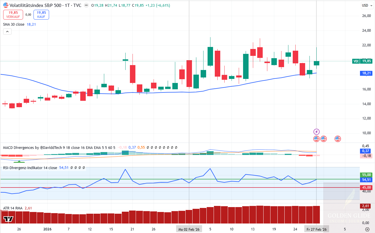 Volatilität: ansteigend zur Monatsmitte, erhöht (16,08 → 23,14)