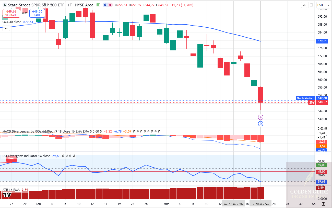 Ein prägnanter Moment war der Wochenschluss mit einem RSI unter 30, während der SPY den Abwärtsimpuls weiter ausdehnte und der VIX erhöht blieb.