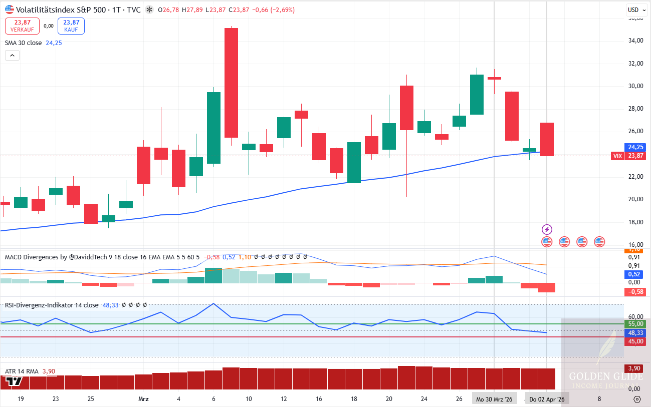 VIX: blieb mit 23,53 bis 31,52 erhöht und zeigte weiter ein angespanntes Umfeld.